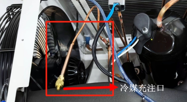 接下来进入正题:使用十字螺丝刀拆下上钣金螺丝 ,找到冷媒充注口 ,并轻轻把它扳到机械外侧。然后拧开密封盖并将阀芯轻松拧松至有气体放出即可。